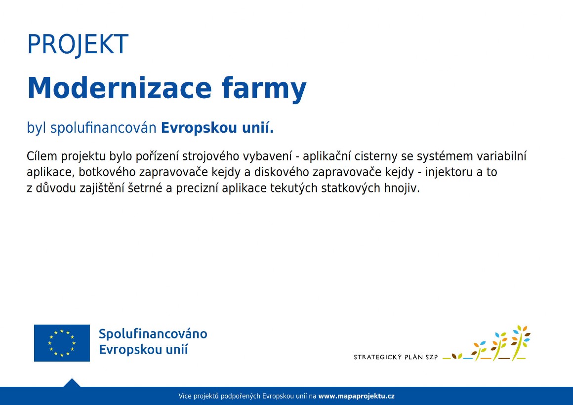 Dne 31.3.2017 byl dokončen projekt "Rekonstrukce teletníku na porodnu prasnic". Hodnota projektu je ve výši 9.192.070,- Kč.